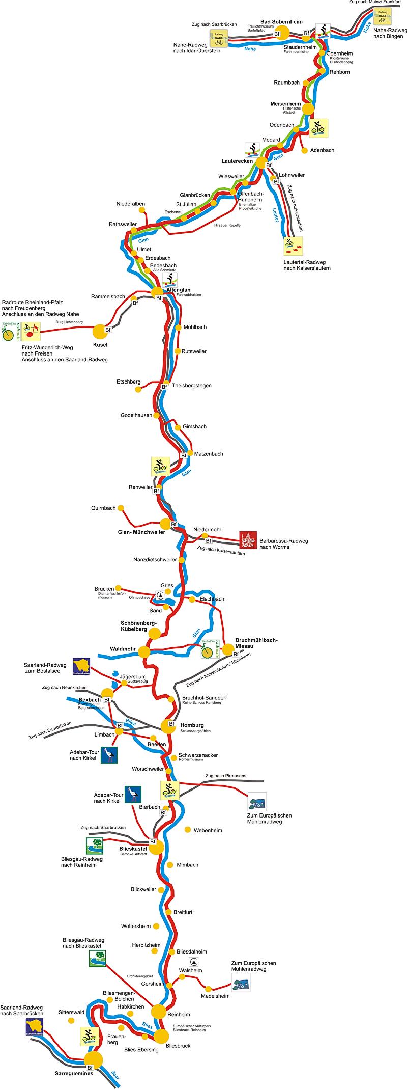 führt von Sarreguemines bis nach Bad Sobernheim. Auf weiten Strecken führt der Radweg entlang der alten Bahntrasse, bzw. parallel zur Bahntrasse auf der heute Fahrraddraisinen fahren.