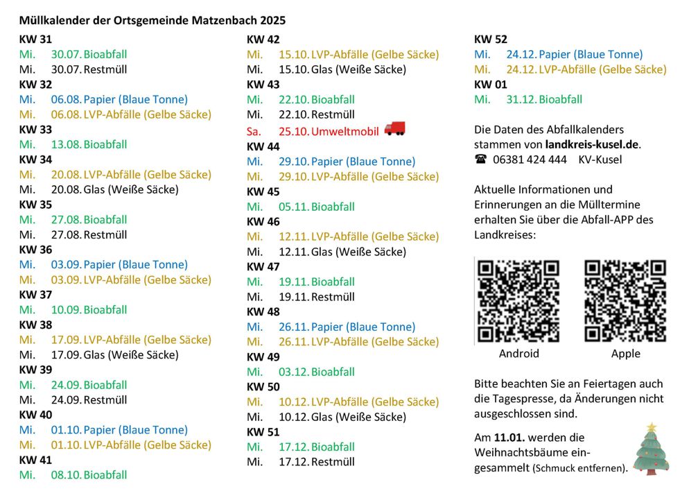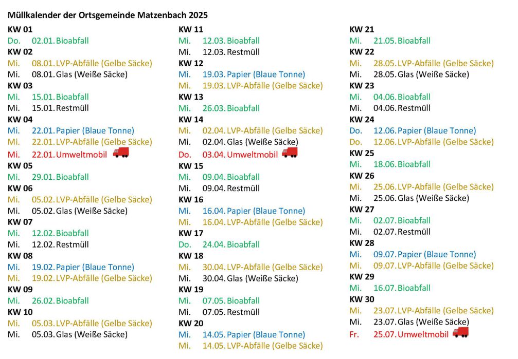 Abfallkalender 2025 für die Gemeinde Matzenbach